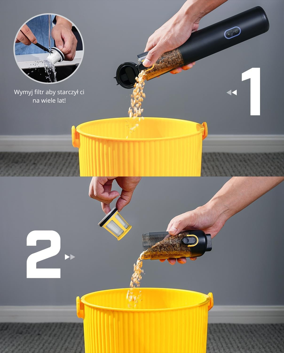 - Opróżnij pojemnik i umyj filtr — zdjęcie idealnie pokazuje ten etap.